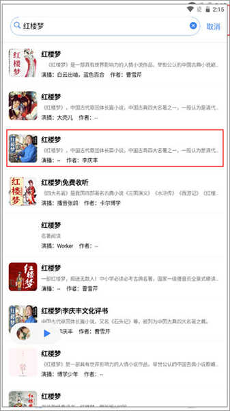 2、这输入关键词后,下方会显示与之相关的书籍音频内容,点击任意一本即可进入播放界面。