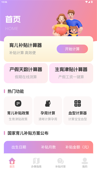 2、直接进入首页,就能使用首页提供的育儿补贴计算器、产假计算、生育津贴计算等功能。