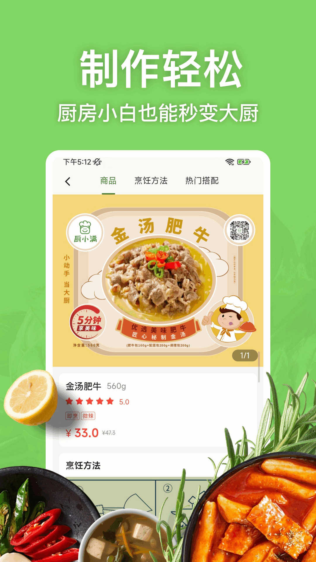 厨小满是一款面向现代家庭的高品质预制菜服务美食应用,旨在解决“做饭困难、缺乏烹饪技巧、时间紧张”等普遍问题。无论是刚接触烹饪的新手,还是希望精进厨艺的进阶爱好者,都能在短短几分钟内,轻松在家烹制出一桌色香味俱佳的可口饭菜。其丰富多元的菜谱资源,让用户足不出户就能享受到媲美餐厅水准的美味体验。