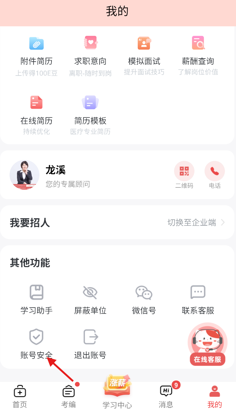 2、进入“我的”页面后,在界面中找到“账号安全”板块,点击进入相关设置。