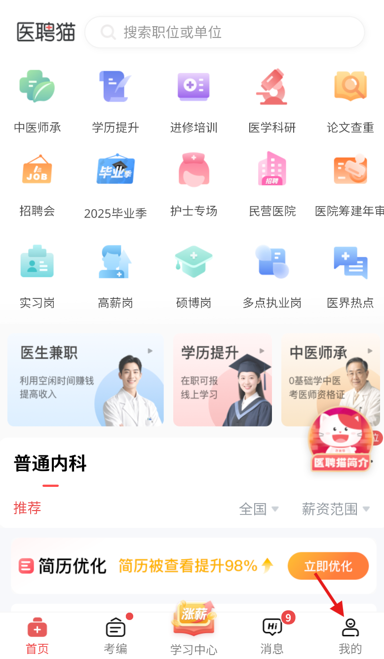 1、启动医聘猫医疗招聘求职人才网软件,进入主界面后找到并点击“我的”选项。