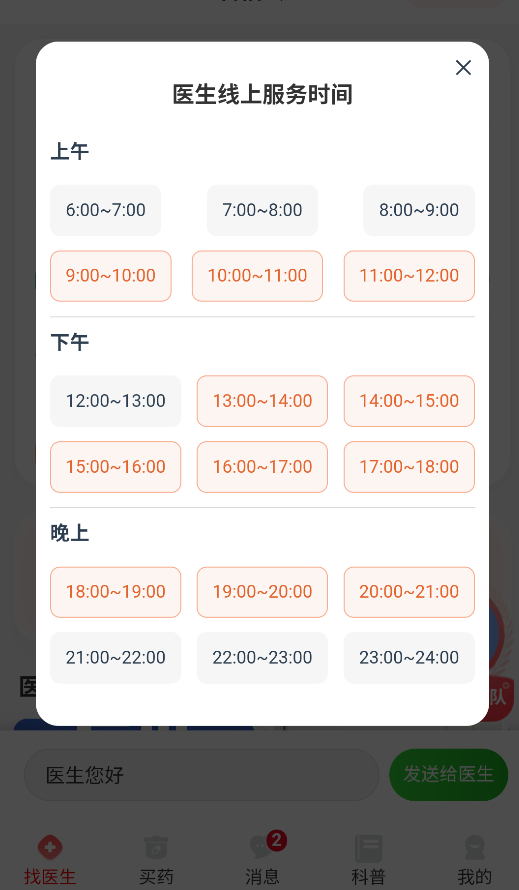 2、医生主页会清晰标注可预约的时段(其中绿色代表可约),用户选择合适的时间后,需要填写基本的症状描述来完成挂号流程。