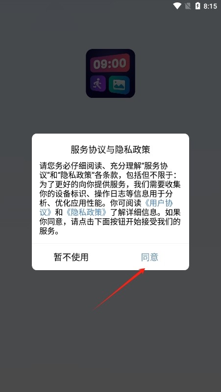 用户打开已安装完成的万能小组件盒子后,需先同意用户服务协议和隐私政策。