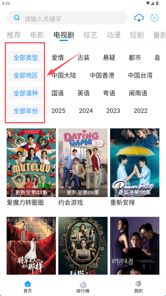 4、点电视剧分类,选全部地区等条件筛选,快速找到想看的剧。