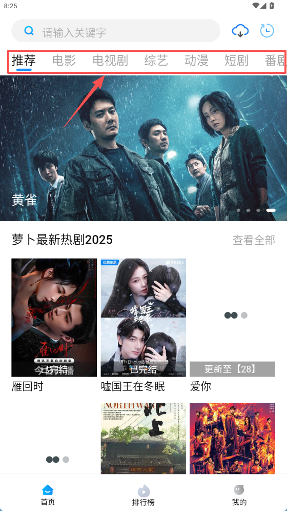 1、点首页推荐看热剧,如黄雀、雁回时等可直接选看。