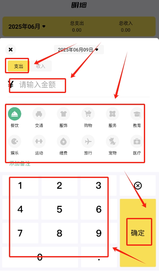 2、记录支出时,需先从各类支出类型中选择一项,接着输入具体的支出金额,在确认信息准确无误后点击保存即可。