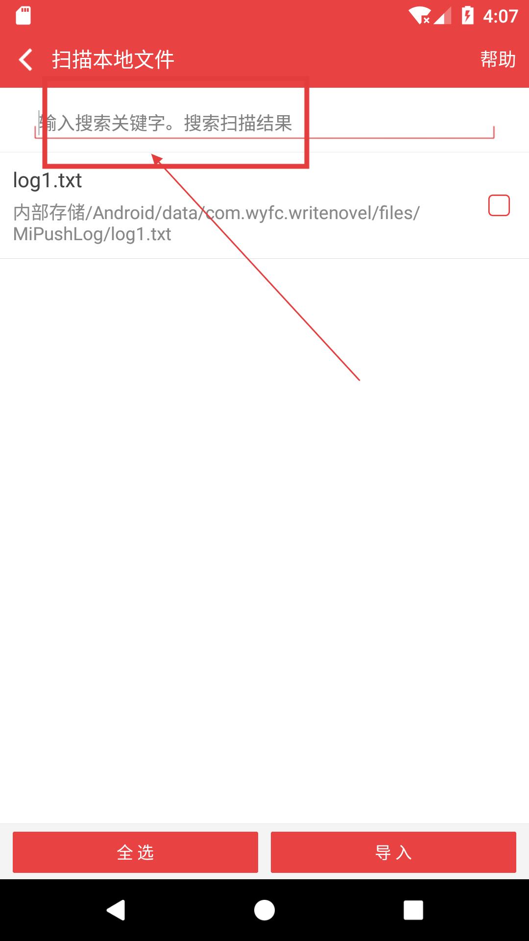 1、在看小说听书软件的本地文件扫描界面,用户能借助搜索框输入关键词来查找文件,界面会以列表形式呈现已扫描到的文件,并且支持全选和导入功能,让添加本地小说的操作更便捷。