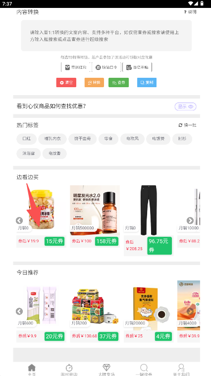 1、在首页导航栏点击“一键搜券”按钮。