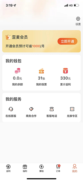 5、在“我的”页面能够查看返现金额,返现过程不收取任何手续费,且无门槛就能申请返现,若遇到疑问可联系客服咨询。