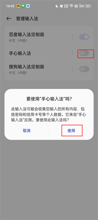 2进入输入法管理界面后,启用手心输入法的使用功能。