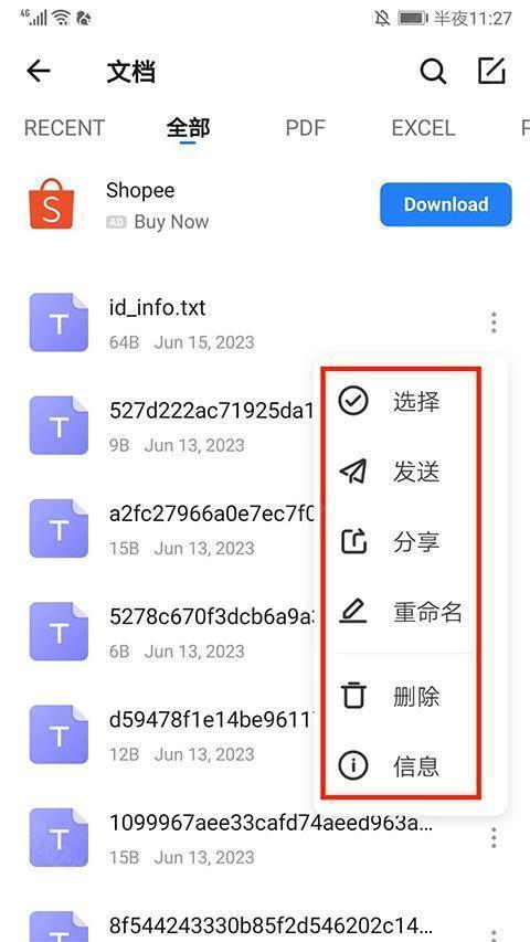 3、进入文件界面,可看到上方已经将手机中的所有文件分为音乐、应用、视频、图片、文档等类别,选择相应的文件可进行选择、发送、分享、重命名、删除、详情等操作,