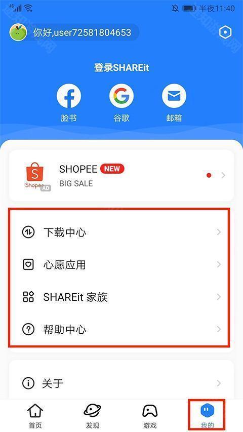 7、在我的界面,包括中心、心愿应用、SHAREit家族和帮助中心等选项,用户可根据需求选择使用,包括查看的文件和查看帮助,以上就是茄子快传的使用方法了。
