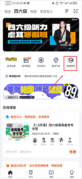 1、打开星火英语,在首页中点击智能模考。