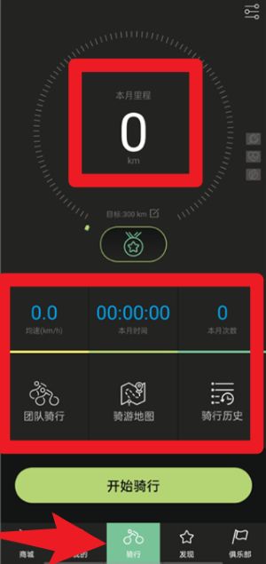 在骑行页面,你可以查看本月累计骑行里程、平均时速、骑行时间和次数,还能进入团队骑行、骑游地图以及骑行历史等功能模块。