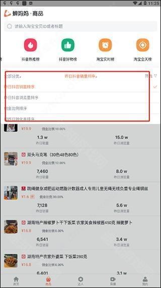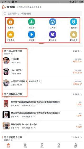 1、打开软件就能看到商品榜单、达人榜单、抖音直播实时榜单等各类数据;