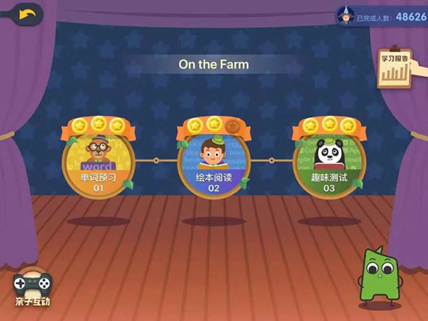 其中绘本阅读这个环节里,有两个部分,分别是:阅读绘本和跟读挑战,可以先跟孩子听一下阅读绘本这个环节,然后再进入跟读挑战。