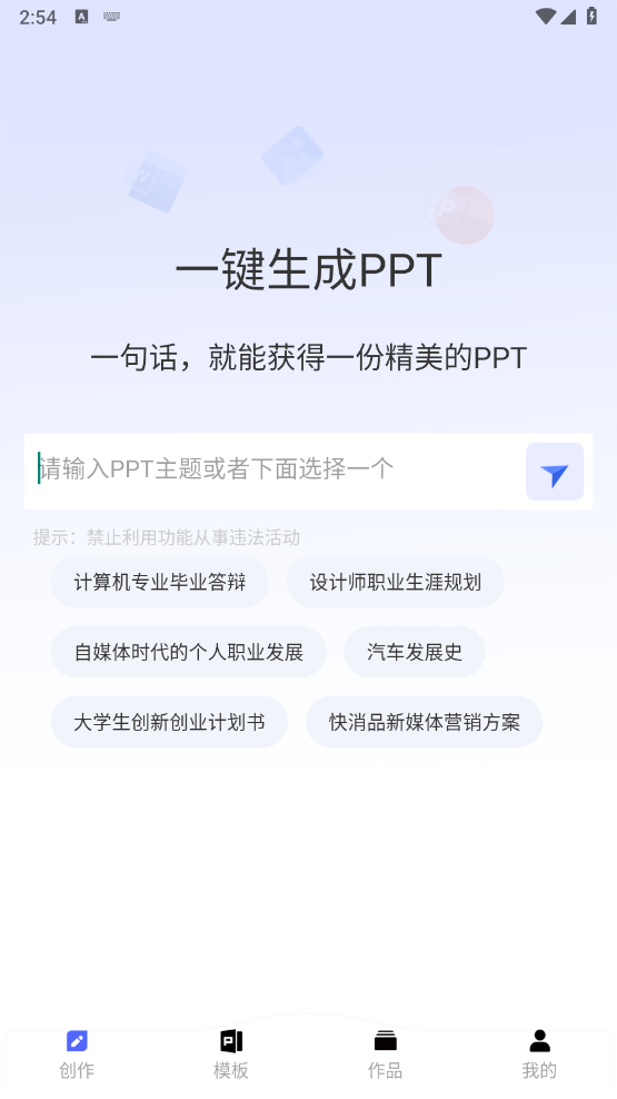 AiPPT专家是一款非常实用的效率办公软件,拥有全能的界面设计,用户可以自由进入首页中制作各种PPT,还提供多样化的PPT模板,随时随地在线应用,允许用户在线编辑调整,灵活提高办公效率,轻松享受优质的服务,还具有丰富的功能和模式,无需任何经验即可上手使用,可以帮助用户轻松保存各种PPT文件并自由管理,能完全满足所有使用需求,还支持多账号登录,可以及时同步各种PPT文档,有需求的用户欢迎软件。