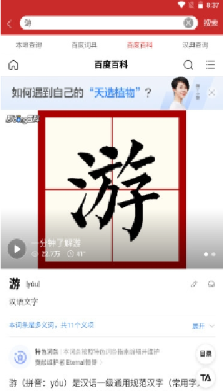 1、用户在此处便能体验到更便捷高效的汉字查找方式,碰到不认识的汉字时,一键搜索即可完成查询。