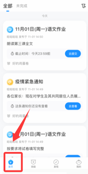 1、下载后使用老师提供的班级码加入班级,就能在消息栏实时接收学校和老师的各项通知。