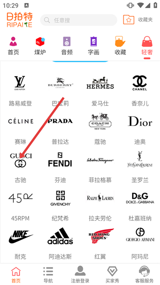 2、在轻奢品牌列表里挑选【古驰】,进入古驰的商品列表页面。
