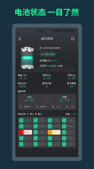 BMS软件主要功能是用于获取锂电池BMS的相关信息,可以直观的了解到锂电池的状态。通过全面掌握电池的相关信息,使电池能够稳定运行,从而更好地了解电池的状况,使用户能够轻松管理自己的电池。平台还提醒锂电池异常故障,随时提醒用户,及时查看处理,确保电池安全使用,BMSAndroid版支持用户设置电池的系统参数。 简单地设定电池参数,就能更好地使用。感兴趣的朋友不要错过。