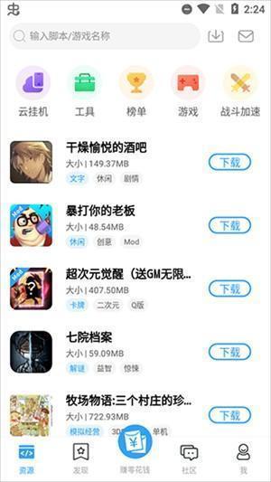 一共分为云挂机、工具、榜单、游戏、战斗加速插件等五个大分类,为用户提供实用的资源分享