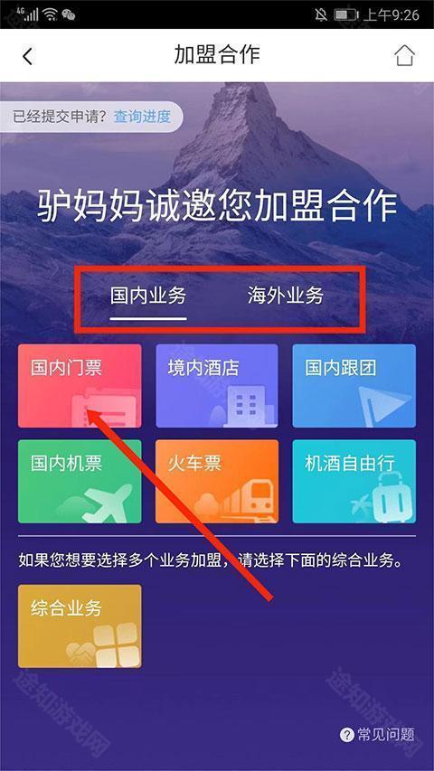 3、进入到加盟合作界面,包括“国内业务”和“海外业务”两大类型,选择需要加盟的业务,这里以“国内门票”为例,