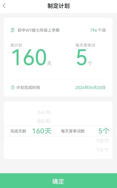 3、设置完成天数和每天背单词的数量,点击下方的确定。