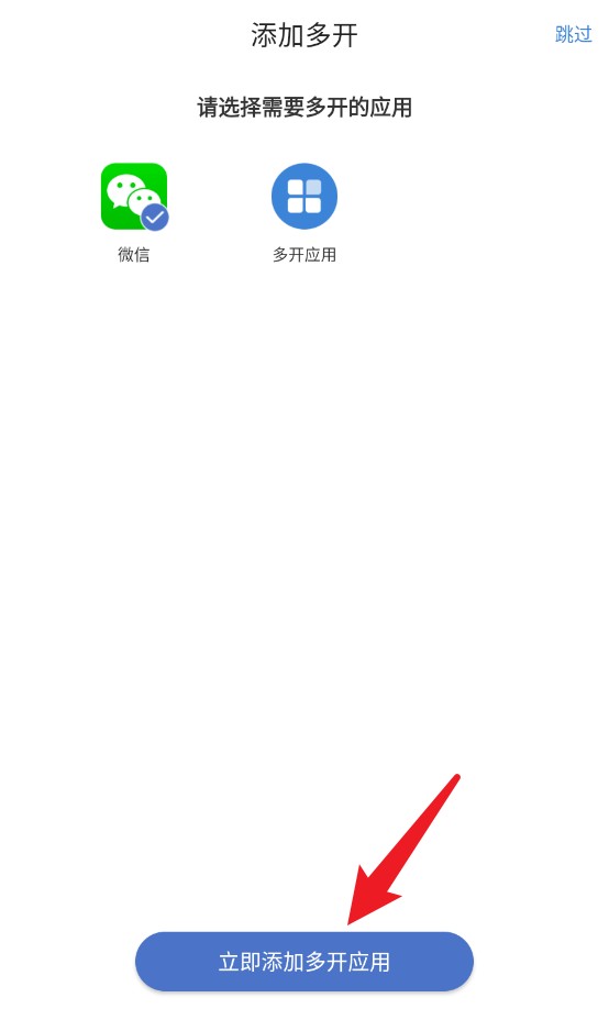 1、在添加多开页面里选中微信图标,接着点击下方的“立即添加多开应用”按钮,即可启动分身创建流程。