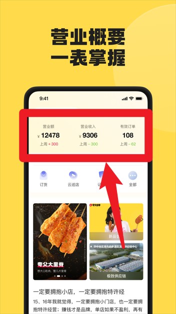 3、登录成功进入首页后,顶部会清晰展示营业额、收入及订单量等经营概况数据,方便用户查看。
