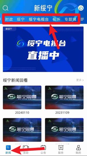 1、打开后,点击首页底部的新闻栏目,就能查看绥宁本地的最新资讯内容,其中包含新闻回看和电视台直播模块。