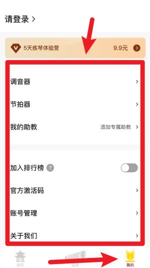 4、在“我的”页面里,用户能够进入调音器、节拍器、账号管理等功能设置界面,同时该页面还支持用户加入排行榜以及激活课程。