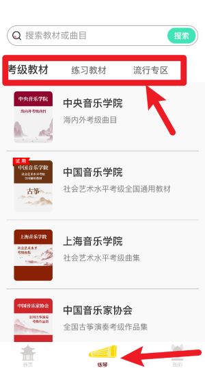 3、点击底部的练琴菜单,进入曲目资源区,这里支持按照考级教材、练习教材或者流行专区的分类来挑选曲目。