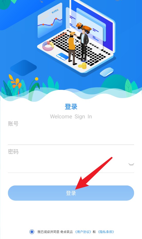 1、打开应用后输入账号密码点击蓝色按钮,即可完成登录进入系统主页面。