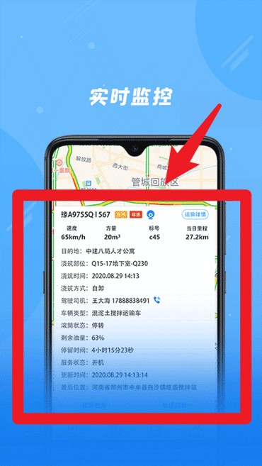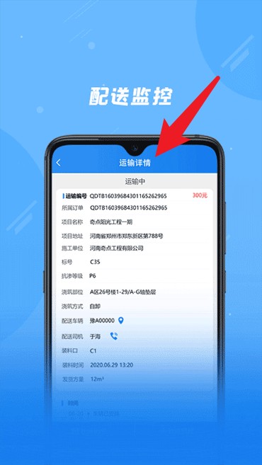 4、配货监控功能支持查看运输单详情,包括项目名称、地址及司机配送信息。