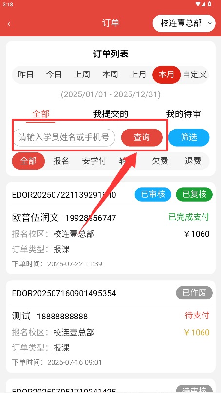 4、输入学员姓名或手机号等关键信息后,点击搜索按钮就能查看对应的订单详情。