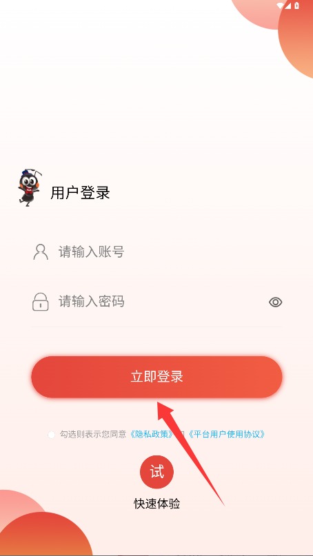 2、在登录界面填写手机号与密码,勾选同意平台相关协议后,点击“立即登录”按钮即可进入应用。
