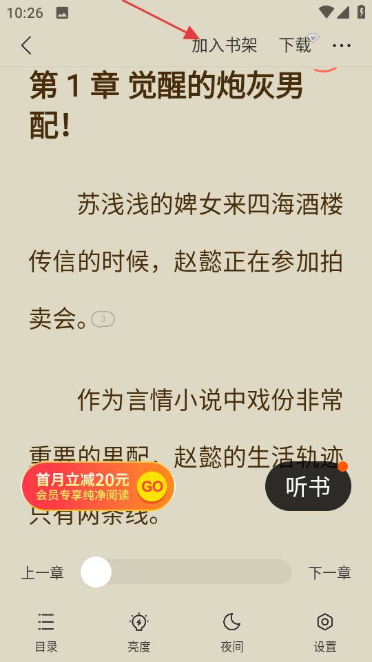 3在阅读界面轻点屏幕,界面上会弹出“加入书架”的选项,通过这一操作可以把你感兴趣的书籍收藏起来,方便后续继续阅读。