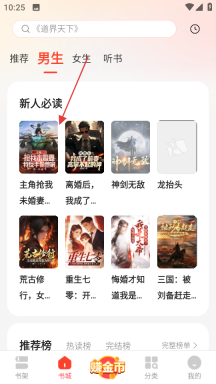 1、在书城男生栏新人必读区,选书籍进入阅读页。