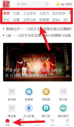 1、在首页导航栏中点击推荐、短视频等栏目,可快速浏览云和本地热点资讯和精彩内容。