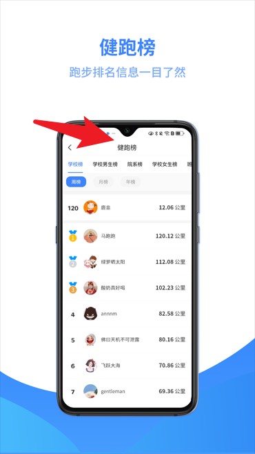 4、点击健跑榜栏目可查看个人及全校的跑步排行数据,便于了解运动表现。