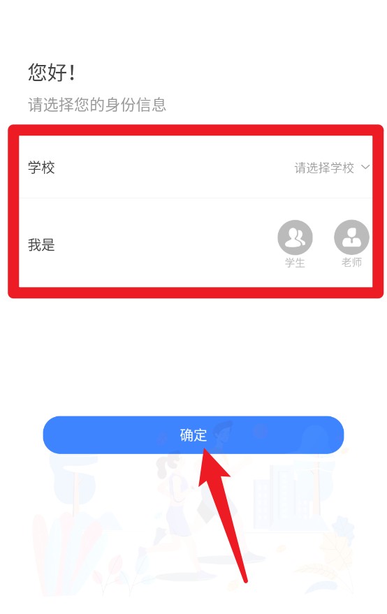 1、进入页面后请先选择所在学校及身份类型,然后点击页面下方蓝色确定按钮继续。