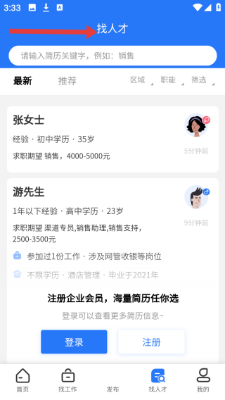 3“寻贤才”板块支持企业通过关键词检索功能筛选求职者简历,呈现包括张女士、游先生在内的人才资料,涵盖其工作经验、教育背景及期望岗位方向等信息。