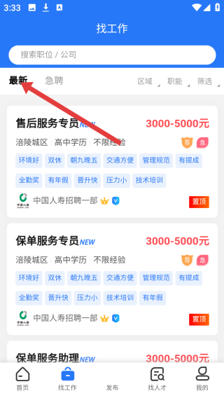 2求职页面的最新板块会优先展示近期发布的岗位,像售后支持专员、保单服务专员这类职位都包含在内,每个岗位都清晰标注了薪资待遇、任职要求以及企业提供的各项福利。