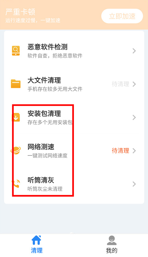 5、借助“安装包清理”功能,能够检测并清理手机里多余的安装包,同时还支持网络测速、听筒灰尘检测等实用功能。