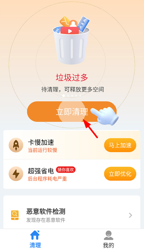 1、安装超神清理App后,打开应用进入首页的清理页面,能选择“垃圾清理”“手机加速”“超强省电”等功能选项,点击“立即清理”按钮即可启动优化流程。