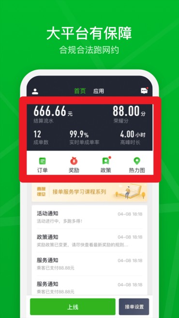 2、主页数据呈现接单收入、接单成功率以及高峰时长,便于司机清楚了解自身的收益情况与服务表现。