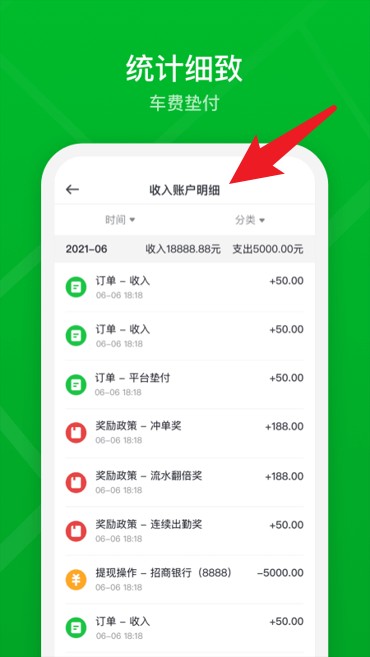 5、账单明细页面会清晰呈现每一笔收入与支出记录,并且对收入类别进行了明确划分,有助于司机更好地管理自身的资金情况。
