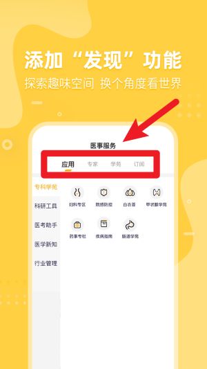 2、发现栏目新增了应用、专家、学苑等分区,用户能够根据自身需求,进入不同的医学主题内容领域进行探索与学习。