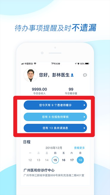 4、首页待办提醒功能突出待处理事项,包含待看诊、待审核与未读消息,避免重要任务遗漏。